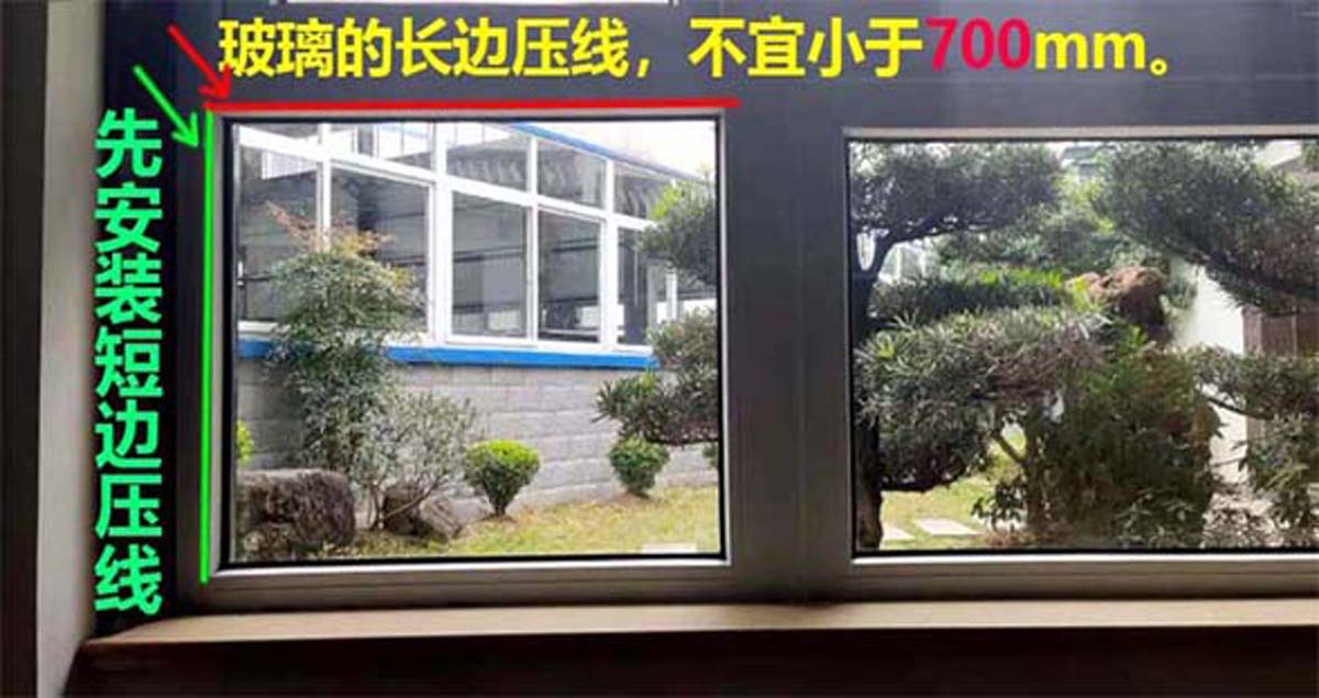 塑鋼門窗玻璃壓線,先安裝短壓線,再安裝長壓線,長壓線安裝時,先將壓線彎曲,將壓線的兩頭扣進(jìn)壓線槽,再用塑膠錘沿壓線兩端往中間敲擊,使壓線完全扣進(jìn)槽內(nèi)。玻璃壓線最少有一邊長度不小于700mm,否則會影響壓線安...
